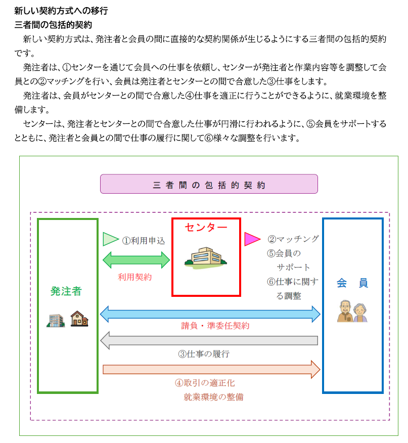 これまでの契約方式では、シルバー人材センターは、発注者から仕事の依頼を受け会員に再委託する形を取っています。新しい契約方式では、発注者と会員の間に直接的な契約関係が生じるようになります。現在、ご発注の個人・企業・団体・地方公共団体のご発注者様に対しては当センターの担当者よりご説明いたします。※労働者派遣事業は対象外