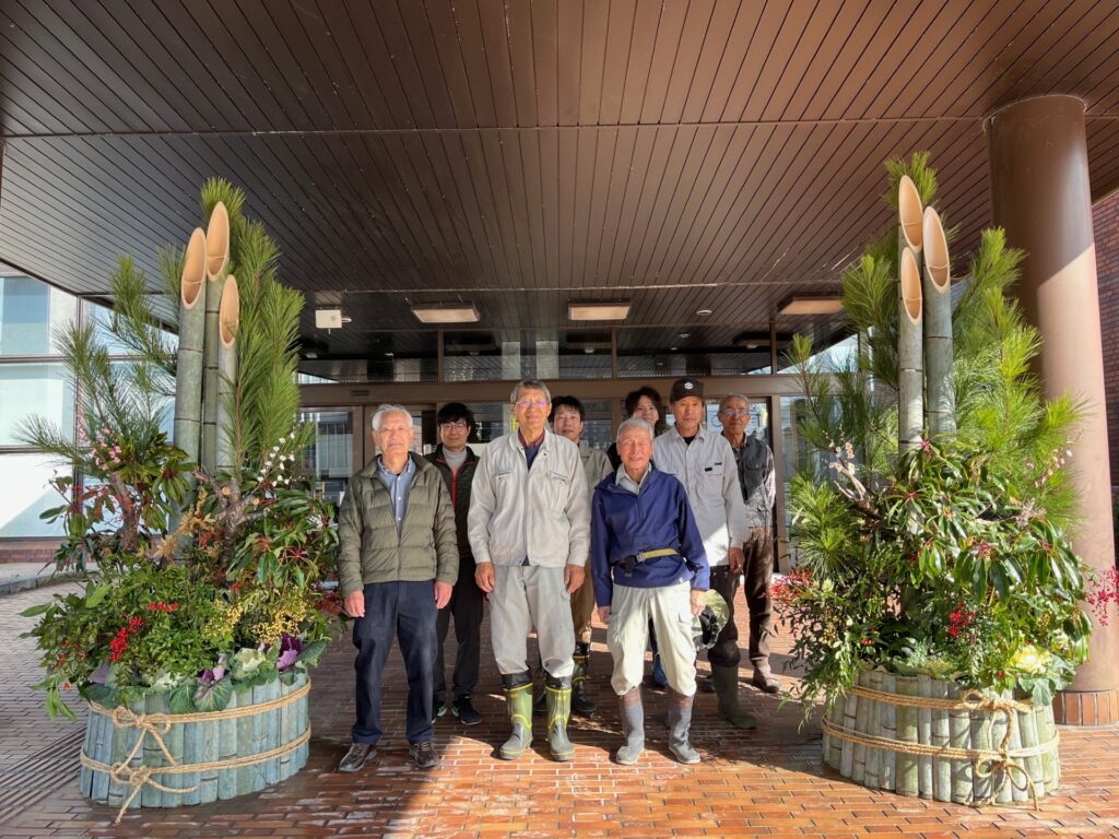 平成21年のお正月から毎年無償で設置し、今回で17回目を数えます。恒例の行事となっており、心待ちにしておられる市民の方もいらっしゃいます。松や竹等の材料を山から切り出し、加工する作業を数日かけて行い、12月22日(日)の午前中に設置しました。約3メートルくらいの高さがあり、迫力のある門松に仕上がっています。1月11日(土)まで設置の予定です。
