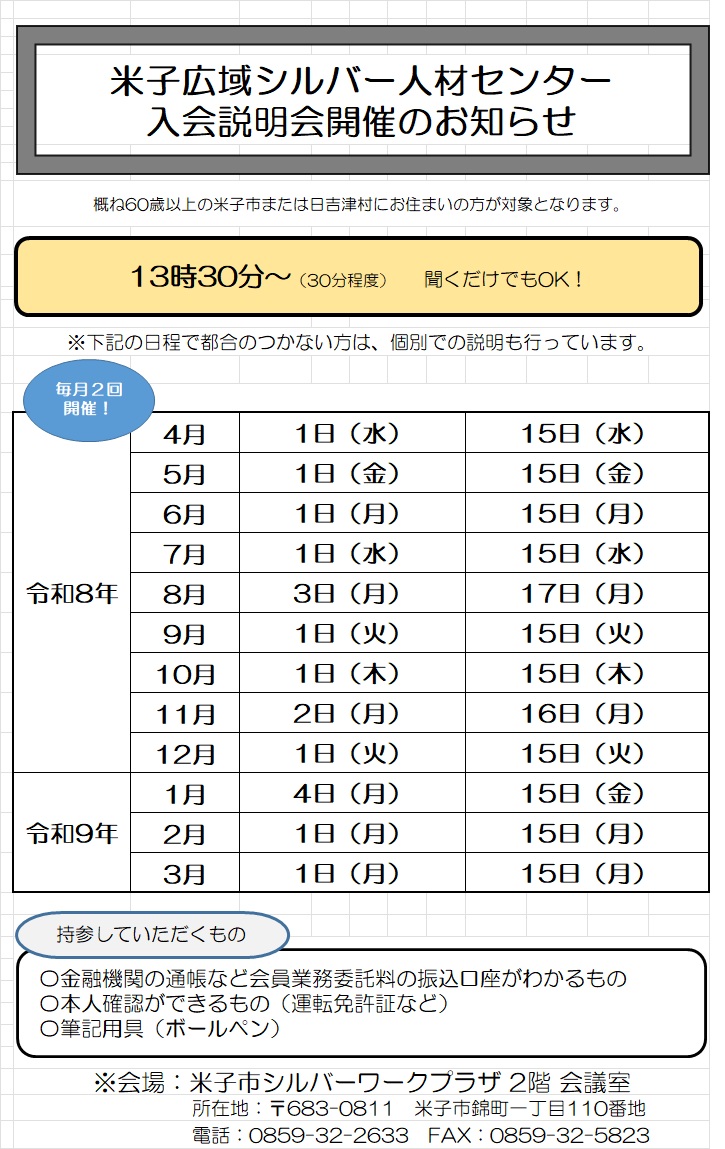 米子広域シルバー人材センター 入会説明会開催日程について